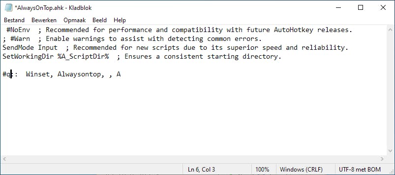 Always On Top is een scriptje. Je downloadt het hier. Open het zipje en je komt bij een bestand dat AlwaysOnTop-2.ahk heet. Wanneer je dit script zou openen in Kladblok lees je een korte code: ^SPACE:: Winset, Alwaysontop, , A. In gewone-mensentaal zegt dit script dat je door Ctrl+Spatiebalk in te drukken ervoor zorgt dat het actieve venster bovenop blijft liggen. Het teken ^ vertegenwoordigt de Ctrl-toets. Bewaar het ahk-bestand in een map ergens op de harde schijf.