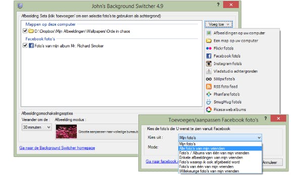JBS (John's Background Switcher) is een van de beste programma's om je bureaubladfoto's mee te wisselen. Het programma kan je foto's uit een map op je computer plukken, maar net zo makkelijk van internet. JBS ondersteunt zoekmachineopdrachten en sociale netwerken als Instagram, Facebook, Flickr en nog veel meer. Als je meer dan één beeldscherm hebt, kies dan bij Meerdere beeldschermen hoe JBS de foto's moet tonen. Je kunt voor elk beeldscherm dezelfde foto instellen, een afwijkende afbeelding of het beeld spreiden.
