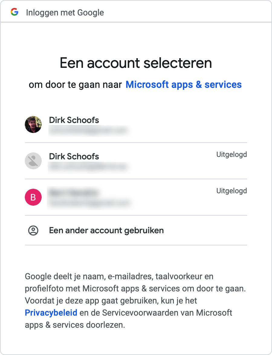 Hierdoor opent de browser een nieuw tabblad waarin het login-scherm van Gmail verschijnt. Voer hier de gebruikersnaam en het wachtwoord in van het Google-account waarvan je de elektronische post wil omleiden naar https://outlook.live.com. Heb je verschillende Gmail-accounts zoals in deze schermafdruk. Dan kun je het gewenste account selecteren door erop te klikken. Google zal je naam, je mailadres, taalvoorkeur en zelfs je profielfoto delen met Microsoft apps & services.