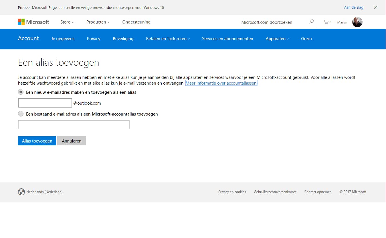 Je komt nu terecht op de pagina waar het primaire e-mailadres wordt weergegeven (en eventueel het gekoppelde telefoonnummer). Heb je verder geen problemen met dit e-mailadres dan kun je het laten staan en simpelweg een nieuw e-mailadres toevoegen door te klikken op E-mailadres toevoegen. Je kunt dan een nieuw Outlook.com-adres aanmaken of een bestaand e-mailadres toevoegen (zoals je Gmail-adres). Let op, in het laatste geval is het natuurlijk niet zo dat je e-mail van Gmail ineens binnenkomt op Outlook (maak je een Outlook-alias, dan is dat wel het geval). Klik nu op Alias toevoegen. Door bij het gewenste adres op Instellen als primair, maak je de nieuwe alias het primaire mailadres.
