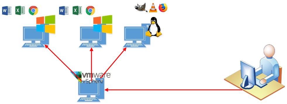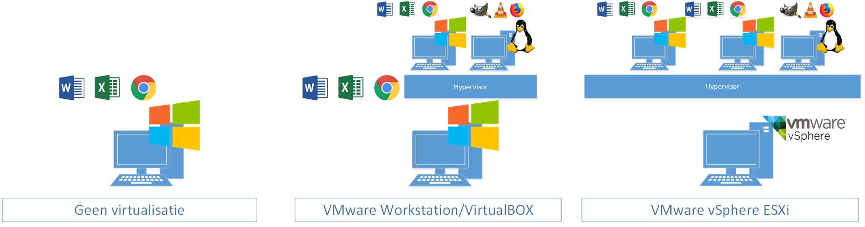 Met VMware ESXi op de pc werkt het anders. Niet Windows of Linux is het besturingssysteem van de pc, maar VMware ESXi. Je logt dan vanaf een andere pc in op de virtualisatieserver en kunt dan tegelijkertijd verschillende versies van Windows, of Windows naast Linux gebruiken. Het laatste is een groot voordeel, omdat je binnen elke virtuele machine alle software kunt installeren die je maar wilt. Alleen dat je de pc niet direct meer kunt gebruiken, is even wennen.