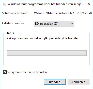 Om de benodigde software te downloaden, ga je via deze link naar de downloadserver van VMware. Je maakt daar eerst een account. Daarna log je in en kies je Download Packages / VMware vSphere Hypervisor 6.7 – Binaries / VMware vSphere Hypervisor (ESXi ISO) image (Includes VMware Tools) / Manually Download. Bewaar het iso-bestand (340 MB) op de computer. Open de map waar het bestand is opgeslagen en plaats een lege cd-r in de cd/dvd-brander. Klik dan met de rechtermuisknop op het bestand en kies Schijfkopiebestand branden. Bevestig dat je een cd wilt branden en zet een vinkje bij Schijf controleren na branden. Klik dan op Branden en wacht tot de cd klaar is.