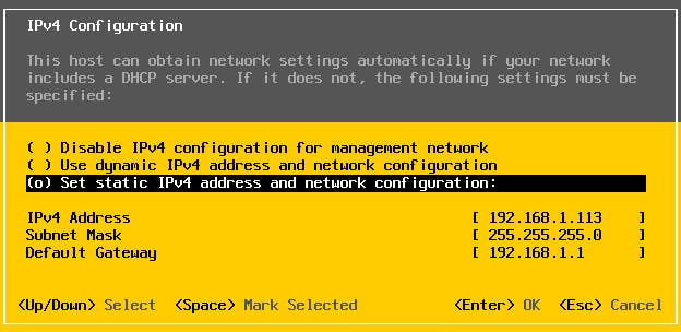 Na de installatie volgt de configuratie. Dit is het enige dat je rechtstreeks op de ESXi-server doet. Druk op F2 om in te loggen op de ESXi-server. De inlognaam is root, typ zelf het bijbehorende wachtwoord. Daarna kom je in het onderdeel System Customization. Hier kun je een beperkt aantal opties aanpassen. Om het ip-adres van de server aan te passen ga je naar Configure Management Network / IPv4 Configuration (druk voortdurend op Enter om de menukeuze te bevestigen). Ga naar beneden met de pijltjestoets en selecteer Set static IPv4 address and network configuration. Druk op de spatiebalk om deze optie te activeren. Ga opnieuw met de pijltjestoets omlaag en typ het gewenste ip-adres in. Het subnet en gateway kun je ongewijzigd laten. Zijn de juiste gegevens ingevoerd, bevestig met Enter om terug te gaan naar het vorige scherm. Ga via de Esc-toets door naar het startscherm en druk op Y om de instellingen aan te passen en de managementinterface opnieuw op te starten. Druk op Esc om de configuratie van de ESXi-server te verlaten.