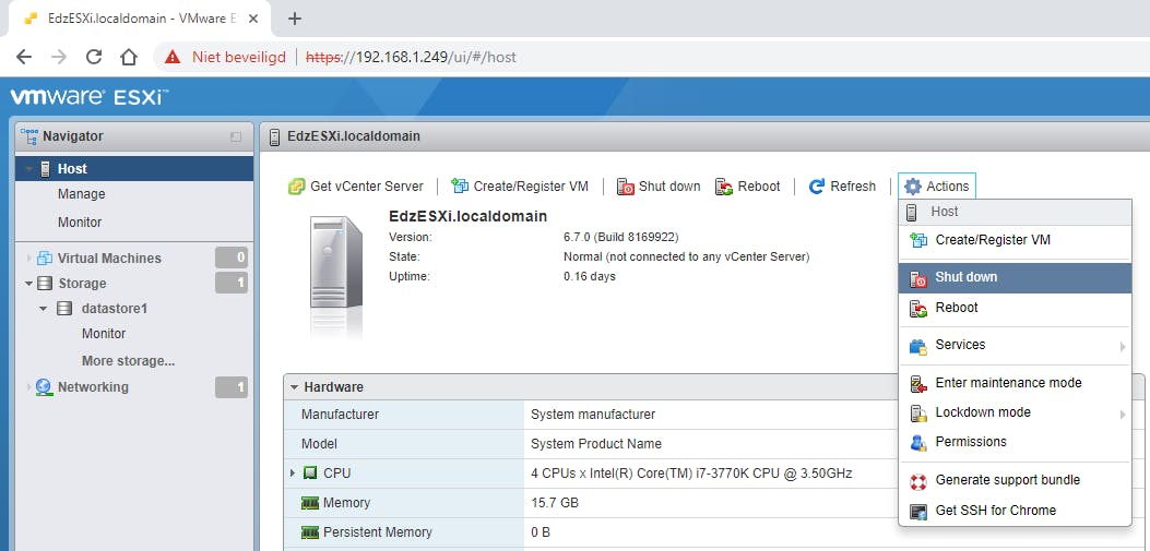 We gaan nu eindelijk écht aan de slag. Je hebt een tweede computer nodig in hetzelfde netwerk. Dat mag een Windows-pc zijn, een Linux-pc, een Mac, een Chromebook … (eventueel een tablet, al is dat wel wat lastiger) als er maar een browser op staat. Start de browser en typ in de adresbalk https:// en dan het ip-adres van de ESXi-server. Log in met gebruikersnaam root en het wachtwoord dat je tijdens de installatie hebt opgegeven.