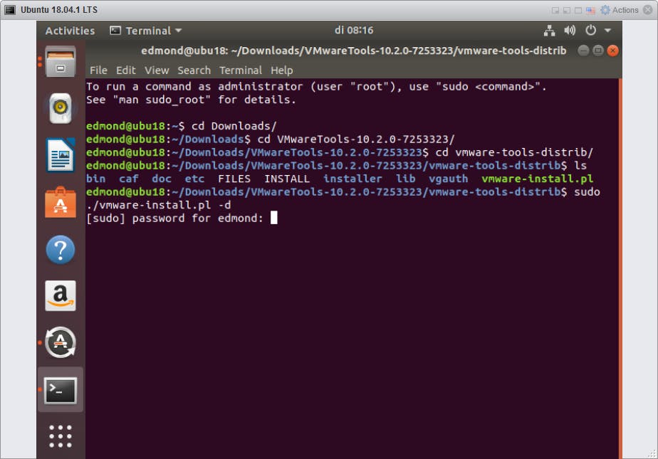 Nadat je de vm hebt gemaakt, klik je op Actions in de bovenste rand van het venster waar de vm in draait, en kies dan Guest OS / Install VMware Tools. Er wordt dan binnen de vm een virtuele cd-rom geladen en onder Windows begint de installatie van de tools doorgaans automatisch. Kies voor Typical om alle tools te installeren. Onder Linux open je de virtuele cd en klik je met rechtermuisknop op VMware Tools …tar.gz en kies je Extract to / Desktop / OK. Of sleep dit bestand eerst naar Downloads en pak het daar uit. Open dan een terminal en ga via het commando cd naar de map waar de tar.gz is uitgepakt. Geef daarna het commando: