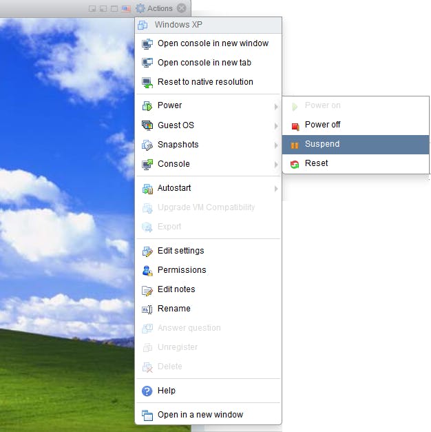 Een virtuele machine werkt als een echte pc, maar is het niet. Dat biedt extra mogelijkheden. Om een virtuele machine te stoppen, klik je op Actions in de rand van het browservenster van de vm en kies je Power / Power Off. Maar je kunt een vm ook pauzeren en later op dat ‘bevroren’ moment verdergaan via de optie Suspend.