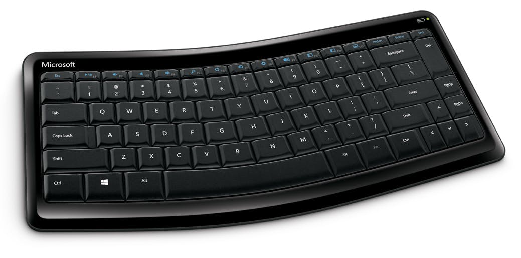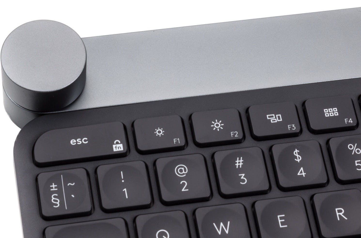 Prijs: € 199,– De prijs van dit toetsenbord is hoog, maar daarvoor krijg je een prima typend toetsenbord dat een plaatje is om naar te kijken, met een unifying-ontvanger voor draadloze communicatie en achtergrondverlichting die oplicht als je je handen over het toetsenbord beweegt. Het meest opvallend is echter die grote, ronde, aanraakgevoelige knop waarmee je in allerlei programma’s sneller kunt werken. Je moet het toetsenbord zo af en toe opladen, want de accu raakt op een gegeven moment leeg. Helaas is het toetsenbord niet ergonomisch gevormd.