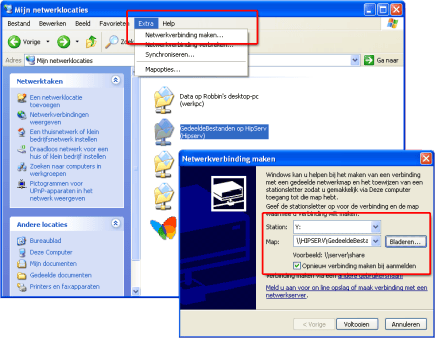 Uw NAS is bereikbaar via Start / (Deze) Computer / Netwerk (of Mijn Netwerklocaties). Hier vindt u de NAS meestal terug als \\NaamVanApparaat. De NAS is ook bereikbaar op \\IpNummerVanUwApparaat. U kunt de netwerkschijf sneller openen door er een schijfletter aan te koppelen. Dit vermindert niet alleen het aantal klikken dat u moet doen naar uw gedeelde bestanden, de schijf wordt ook sneller benaderd door Windows. Zoek uw netwerk harde schijf op via (Deze) Computer. Selecteer de bron die u bereikbaar wilt maken met een schijfletter door de map aan te klikken. Kies in het menu Extra voor Netwerkverbinding maken. Windows vraagt om een schijfletter, bijvoorbeeld Z. Plaats een vinkje bij Opnieuw verbinding maken bij aanmelden. Hiermee wordt de schijfletterkoppeling automatisch aangemaakt. De gedeelde bron op uw netwerkschijf is vanaf nu zichtbaar als schijfletter in (Deze) Computer. De koppeling is eenvoudig ongedaan te maken via het menu Extra / Netwerkverbinding verbreken in (Deze) Computer.