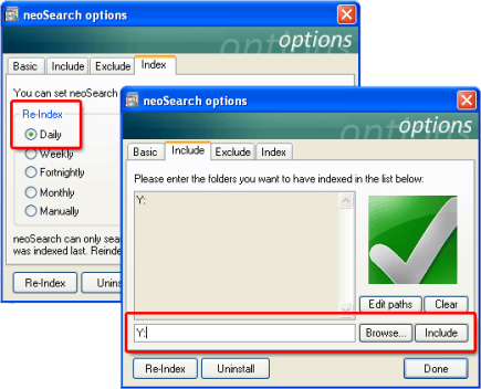 De zoeksnelheid van neoSearch is hoog omdat het programma een database aanlegt waarin de zoekopdracht wordt uitgevoerd. Deze index kunt u naar wens aanpassen en regelmatig laten verversen. Open de instellingen van neoSearch met Options en kies het tabblad Include. Klik op Clear om alle schijven die standaard worden geïndexeerd te verwijderen. Gebruik de knop Browse en blader naar de gedeelde bron op uw netwerk harde schijf. Als u een schijfletter koppeling hebt gemaakt (stap 1), klik deze dan aan. Bevestig met de knop Include. Herhaal dit voor alle schijfstations die u wilt opnemen in de database en bevestig met Done.