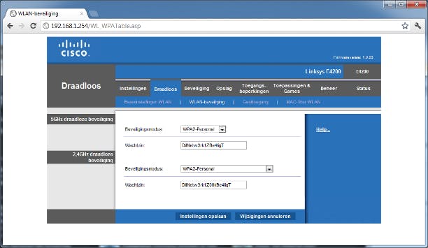 Behalve de computer moet ook het netwerk afgeschermd worden. Dat doet u door het netwerkverkeer, althans voor het draadloos netwerk, te versleutelen. Dit is iets wat op de router moet worden ingesteld door WPA of liever WPA2 in te schakelen en een sleutel in te geven. Daarna moet u deze sleutel op alle apparaten die het draadloos netwerk mogen gebruiken, instellen. Dat een apparaat die sleutel kent, is het bewijs dat het een betrouwbaar apparaat is.