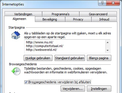 Telkens handmatig de sporen van uw surfgedrag moeten wissen is niet handig. Het is veel gemakkelijker om dat automatisch te laten gebeuren. Internet Explorer kent hiervoor via Extra / Internetopties / Algemeen bij Browsegeschiedenis de optie Browsegeschiedenis verwijderen bij afsluiten. Door eerst op Verwijderen te klikken kunt u de onderdelen kiezen die u wilt verwijderen en die u eventueel wilt behouden. Terug op het tabblad Algemeen kunt u bij de Instellingen extra opties kiezen, zoals het tot nul terugbrengen van het Aantal dagen dat pagina's worden bewaard in de geschiedenis.