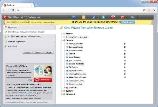 Google Chrome mist de mogelijkheid om bij het afsluiten van de browser automatisch de zoekgeschiedenis te verwijderen. Click&Clean voegt deze ontbrekende functie aan Chrome toe. Klik op het gereedschapssleuteltje / Opties / Extensies / Meer extensies ophalen. Klik dan in het zoekvenster en zoek op Clean. Click&Clean wordt meteen gevonden. Klik dan op Toev. aan Chrome en bevestig met Installeren. Ga terug naar de Extensies en klik bij Click&Clean op Opties. Klik op Clear Private Data when Browser Closes en haal het vinkje weg bij Disabled. Klik op het plusje voor Chrome en zet vinkjes bij de gegevens die u automatisch wilt verwijderen bij het sluiten van Chrome. Als u klaar bent, sluit u het tabblad. De opties zijn nu bewaard.