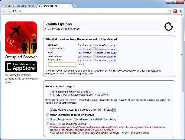 Als alternatief voor het zelf beheren van de cookies in Chrome, kunt u ook de Vanilla Cookie Manager installeren. Dit is een extensie voor Chrome te vinden via het instellingen-icoon / Opties / Extensies / Meer extensies ophalen en een zoekopdracht op Vanilla. Daarna vindt u een tweede tabblad in Chrome met de Vanilla Options. Daar kunt u bijvoorbeeld instellen om de cookies automatisch te verwijderen via de optie Clear unwanted cookies on startup. Ook kunt u er sites Whitelisten die u vertrouwt en kunt u van de ongewenste cookies aangeven dat deze na een bepaald aantal minuten automatisch worden verwijderd. Verander in het dropdownmenu daarvoor Do not auto delete unwanted cookies in een van de andere opties zoals Auto delete unwanted cookies after 20 minutes.