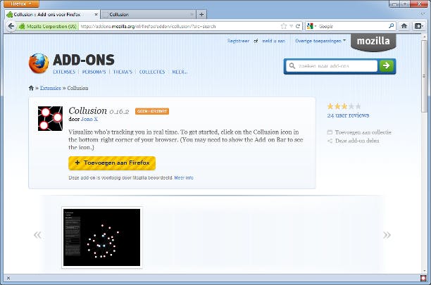 Het zal u wel duidelijk zijn dat u heel gemakkelijk op internet teruggevonden kunt worden, en hoe sites u gerichte advertenties, gericht op uw voorkeuren, kunnen aanbieden. Bent u benieuwd wie er allemaal informatie over u verzamelt? Voor Firefox is een eerste versie van een nieuwe extensie verschenen die dat heel inzichtelijk maakt. Start Firefox en ga naar Extra / Addons. Ziet u het menu niet, druk dan even de linker Alt-toets in. Klik op Extensies en gebruik de zoekfunctie rechtsboven om te zoeken naar Collusion. Selecteer het en klik op Installeren. Collusion heeft weinig opties, u hoeft er dan ook niets aan te veranderen. Sluit het tabblad van de Add-onbeheerder en gebruik de browser zoals u gewend bent.