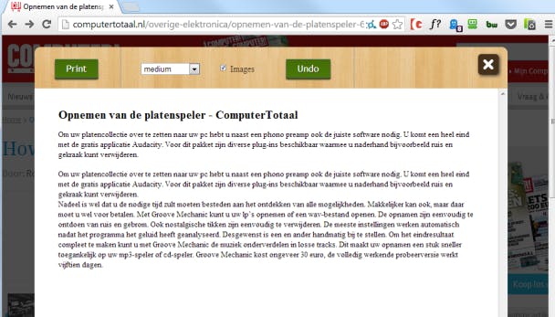 PrintEco werkt ook in Internet Explorer en Firefox. Chrome-gebruikers dienen de PrintEco apart te installeren via de Chrome Store. PrintEco is bijzonder handig om de essentie van een webpagina af te drukken. Je activeert een PrintEco-afdruk via het menu Bestand (druk op de Alt-toets als je dit menu niet ziet) in je browser.