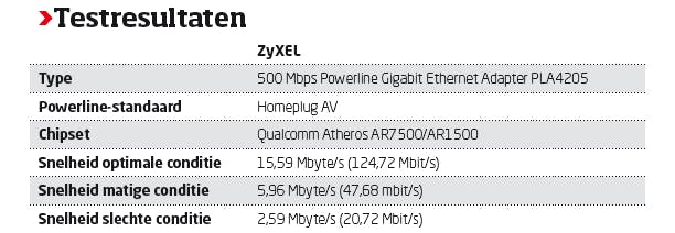 Voor de snelheidstest hebben we dezelfde procedure gebruikt als bij de eerdere 500Mbit/s-setjes die we in 2011 getest hebben. U vindt deze tests terug op onze website. We gebruiken een optimale, een matige en een slechte conditie, waarbij de verschillen zitten in kabellengte en stroomgroepen. Helaas is het bij powerline zo dat u in uw eigen huis heel andere snelheden kunt halen. De behaalde snelheid is namelijk afhankelijk van de staat van het elektriciteitsnetwerk. Zo maakt het verschil of de twee adapters op wandcontactdozen op dezelfde stroomgroep of op verschillende stroomgroepen zijn aangesloten. Ook de kabellengte tussen de twee adapters, lassen tussen de kabels en storingsbronnen als magnetrons, zijn van invloed op de snelheid. De enige manier om erachter te komen hoe powerline bij u thuis presteert, blijft helaas het zelf uitproberen. Overigens zijn de 500Mbit/s-setjes alleen interessant als de adapters relatief dicht bij elkaar zijn aangesloten. Bij wat grotere afstanden blijkt de 200Mbit/s-standaard in de praktijk net zo snel te zijn. Helaas is ook dit een kwestie van uitproberen. De ZyXEL-adapters zijn niet de snelste die we ooit zagen, maar presteren in vergelijking met andere adapters zeker niet slecht. Het zit een beetje in de middenmoot. De snelste adapters die we getest hebben komen nog steeds uit de stal van NETGEAR. De ZyXEL-adapters zijn ongeveer gelijkwaardig aan de Devolo dLAN 500 AVmini Network Kit die we eerder getest hebben.