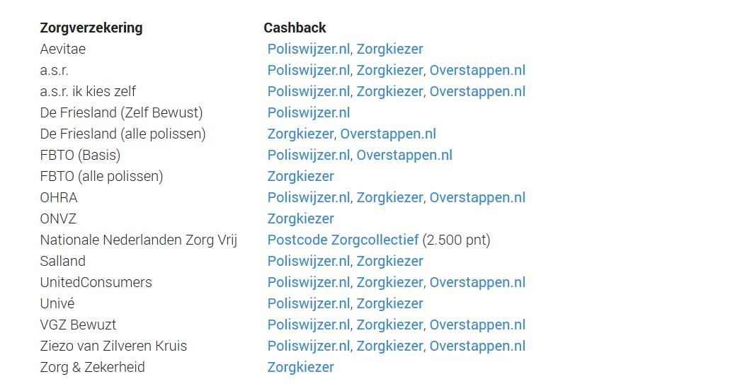 3. Bekijk in het overzicht welke verzekeraar via welke vergelijker (Poliswijzer, Zorgkiezer of Overstappen) beschikbaar is.