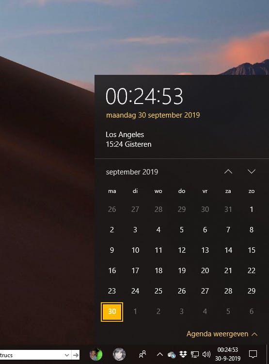 In principe is één systeemklok meestal genoeg. Maar als je veel contact hebt met mensen in het buitenland, dan kan het handig zijn om ook de tijd van het desbetreffende land weer te geven. Dat realiseer je door in Instellingen te klikken op Tijd en taal en vervolgens op Klokken voor verschillende tijdzones toevoegen. Wanneer je een klok hebt toegevoegd en je klikt op de klok rechtsonder in het systeemvak, dan zie je naast de Nederlandse tijd, ook de tijd van de klok die je hebt toegevoegd.