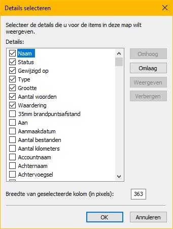 In de Windows Verkenner zie je altijd de standaardkolommen als Naam, Grootte en Gewijzigd op. Maar bestanden hebben vaak veel meer eigenschappen. Als je die ook wilt kunnen zien, klik dan met je rechtermuisknop op de kolomkoppen / Meer voor een volledig overzicht van de opties. Zo kun je zelfs voor Word-documenten aan laten geven hoeveel woorden ze bevatten!