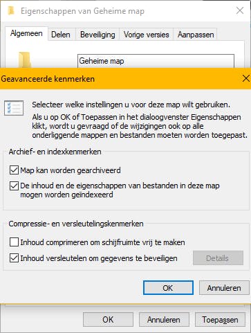 Wil je voorkomen dat iedereen de inhoud van een bepaalde map kan zien? Beveilig hem dan. Rechtsklik op de map, klik op Eigenschappen / Algemeen / Geavanceerd / Inhoud versleutelen om gegevens te beveiligen. De versleuteling is gekoppeld aan je gebruikersaccount. Wanneer iemand anders de map benadert, is de inhoud niet te ontcijferen.