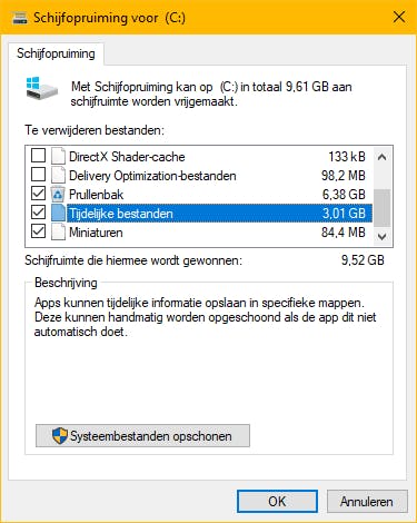 Hetzelfde geldt voor de map WinSXS, die eveneens veel ruimte in beslag neemt. Kun je deze map ook zomaar wissen? Absoluut niet! Wanneer je dit doet, kan Windows onherstelbaar beschadigd raken, met een herinstallatie tot gevolg. Wel kun je de grootte van de map reduceren door Schijfopruiming te draaien (zoek in Start op schijfopruiming).